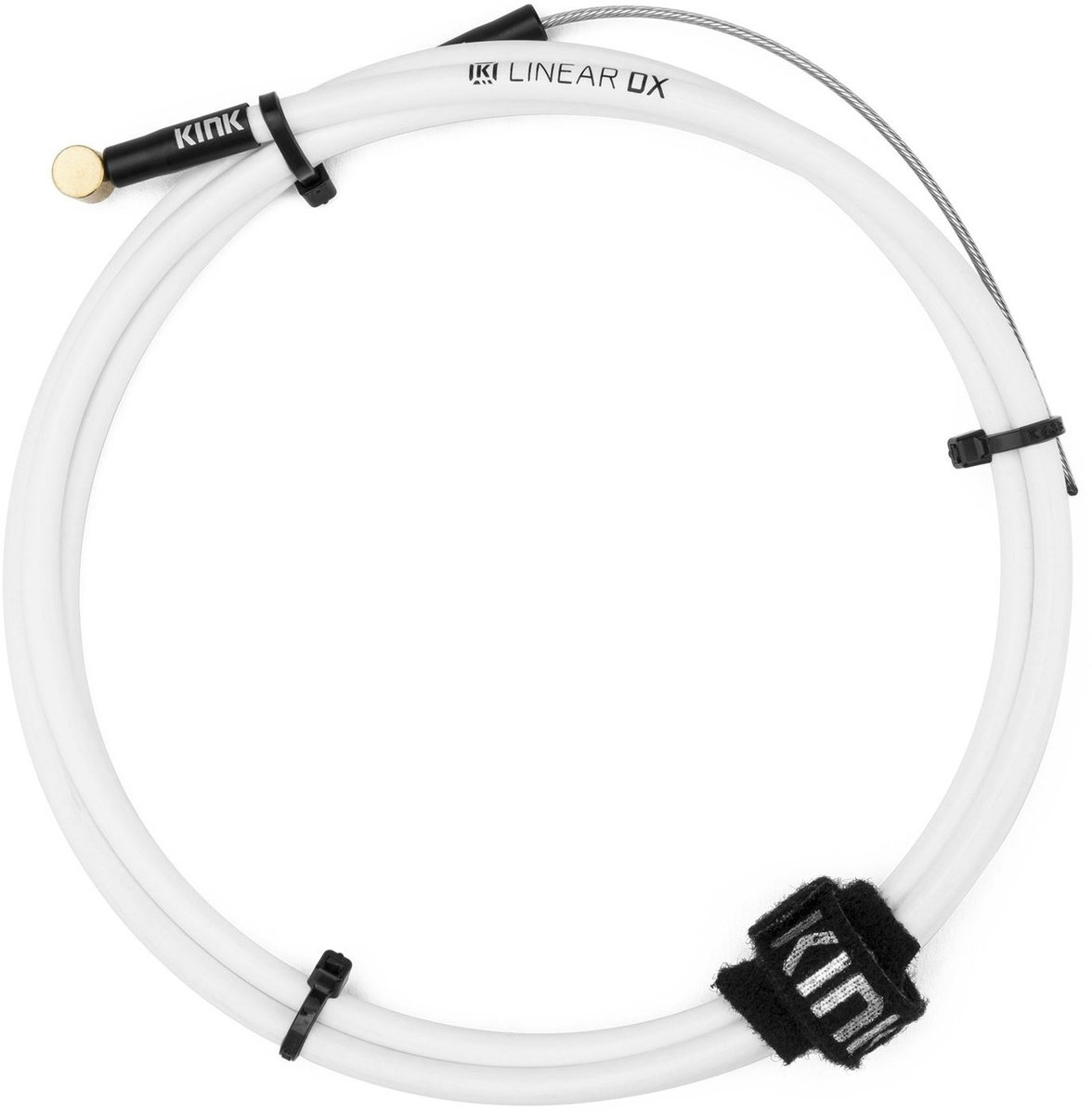 The Kink Linear DX cable features an outer linear strand housing, which decreases bind when the cable twists during tricks. The custom brass lever lug allows the inner wire to twist freely within the brake lever eliminating twist and bind even further. The inner 1.5mm cable is ground smooth to create an even smoother, drag-free pull. Aluminum ferrules prevent housing failure at both ends, and can easily be refitted after cable trimming.